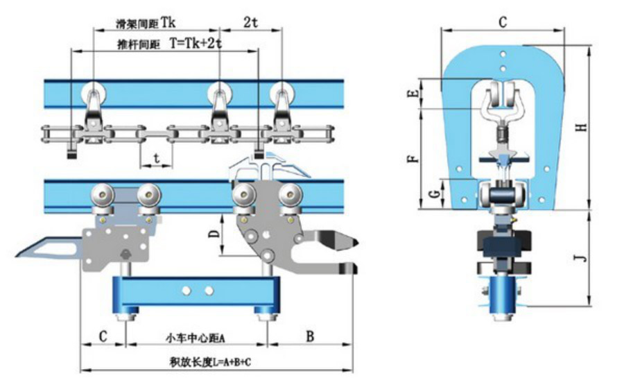 ZHZWJ4、ZHZWJ6積放式輸送機(jī)系統(tǒng)承載軌到采用特制的單面翻邊高錳合金槽鋼,使積放小車導(dǎo)輪與軌道之間的接觸由原來的線接觸變?yōu)槊娼佑|,提高了系統(tǒng)運(yùn)行的穩(wěn)定性和可靠性。新型的前小車采用獨(dú)特的設(shè)計(jì),將升降爪和止逸爪有機(jī)的結(jié)合為一體,簡化了整體結(jié)構(gòu),保證了升降爪垂直升降的靈活性和可靠性。前鏟和尾鏟設(shè)計(jì)新穎,使系統(tǒng)的積放平穩(wěn)、精確。道岔采用全新的設(shè)計(jì),拋棄了原來的傳遞方式,使各種道岔完全形成標(biāo)準(zhǔn)化系列,簡化了線路設(shè)計(jì)程序。